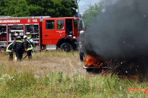 Aufbau zum Löscheinsatz mit Schaum bei einem PKW-Brand.